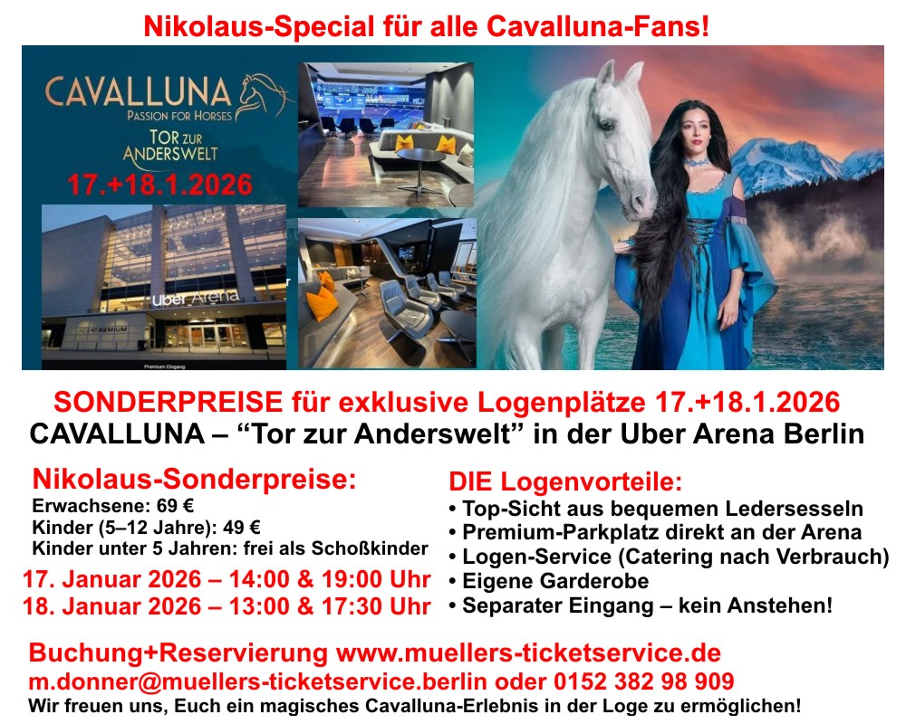 Für die beeindruckenden CAVALLUNA-Shows „Tor zur Anderswelt“ am 17. Januar 2026 (14:00 & 19:00 Uhr) sowie am 18. Januar 2026 (13:00 & 17:30 Uhr) in der Uber Arena bieten wir Ihnen exklusiv über reiten-in-berlin.de vergünstigte Logenplätze an.