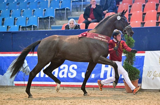 Unter den 31 Hengsten des Springlots körte die Kommission 14 Hengste – vier Hengste wurden prämiert. Zum Siegerhengst kürte die Körkommission Kat.Nr. 34 den Sohn des Diarado aus einer Mutter von Cascadello I aus der Zucht von Lou Gabe van der Zwaag aus Musselkanaal. Ausgestellt wurde er von Schep International Trade BV aus Tull en’t Waal aus den Niederlanden. Der Ehrenpreis für den Züchter des Siegerhengstes, eine Kolibri-Statuette, geht damit für ein Jahr in unser niederländisches Nachbarland. Der Sportkommissar Springen, André Thieme, schwärmte für den Junghengst: „Dieser Hengst hat über die Tage keinen Zweifel aufkommen lassen, dass er über die Qualitäten eines Siegerhengstes verfügt. Das Springen absolvierte er mit viel Übersicht. Am Ende demonstrierte er ein fast endloses Vermögen mit einer super Technik – ein richtiger Springer, den man gern reiten würde.“ Mit Kat.Nr. 46, ein Sohn des Toys, mütterlicherseits über Ramirado-Alasca gezogen, empfahl sich ein weiterer qualitätsvoller Junghengst der Kommission, die ihn im Lot der Prämienhengste als Reservesieger kürte. Züchter ist Theodor Johannsen aus Tarp und ausgestellt von der Agrar Handelsgesellschaft Salzfurtkapelle mbH & Co. KG aus Zörbig. Mit einer Prämie ausgezeichnet wurde ebenfalls ein Sohn des Blue Diamond aus einer Mutter von Cellestial-Glenn Almé aus dem hocherfolgreichen Züchterhaus Volkmar und Heike Schadock im brandenburgischen Heideblick. Der besonders sportliche und drahtige Junghengst beeindruckte mit viel Potenzial und schneller Reaktion. Familie Schadock bekam die Goldmedaille des Landes Brandenburg für besondere Tierzuchtleistungen durch den Fachrefenten für Tierzucht im Land Brandenburg, David Bahnemann, überreicht. Die vierte Prämie ging an Kat.Nr. 23, einen Sohn des Casino Grande – Acolito – Ascudo I, Züchter ist Otto Krone aus Söhlde und ausgestellt wurde er von Jan Crome-Sperling aus Lutter.