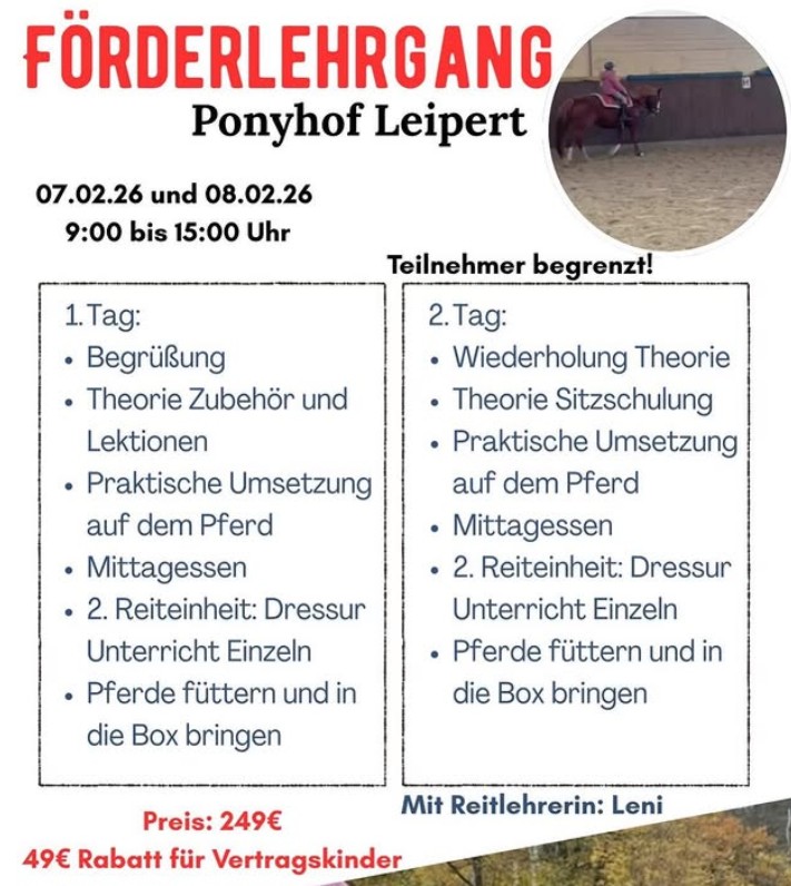Alle weiteren Infos zum Angebot findet man auf www.ponyhof-leipert.de oder www.instagram.com/ponyhof.leipert